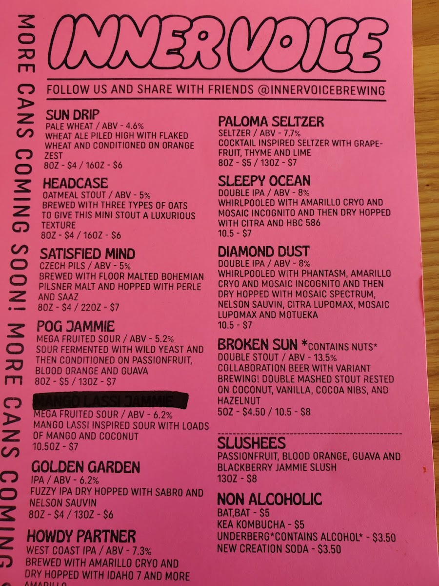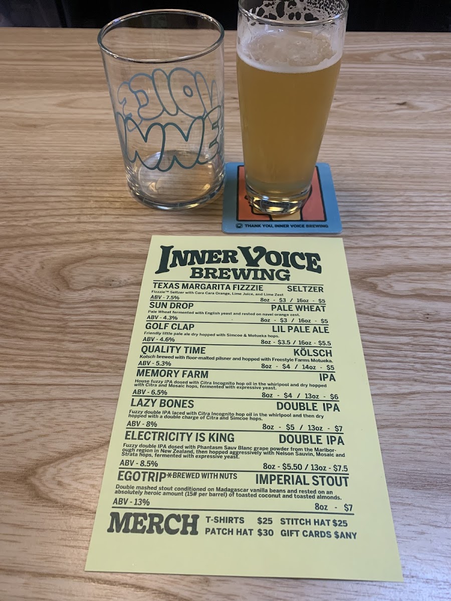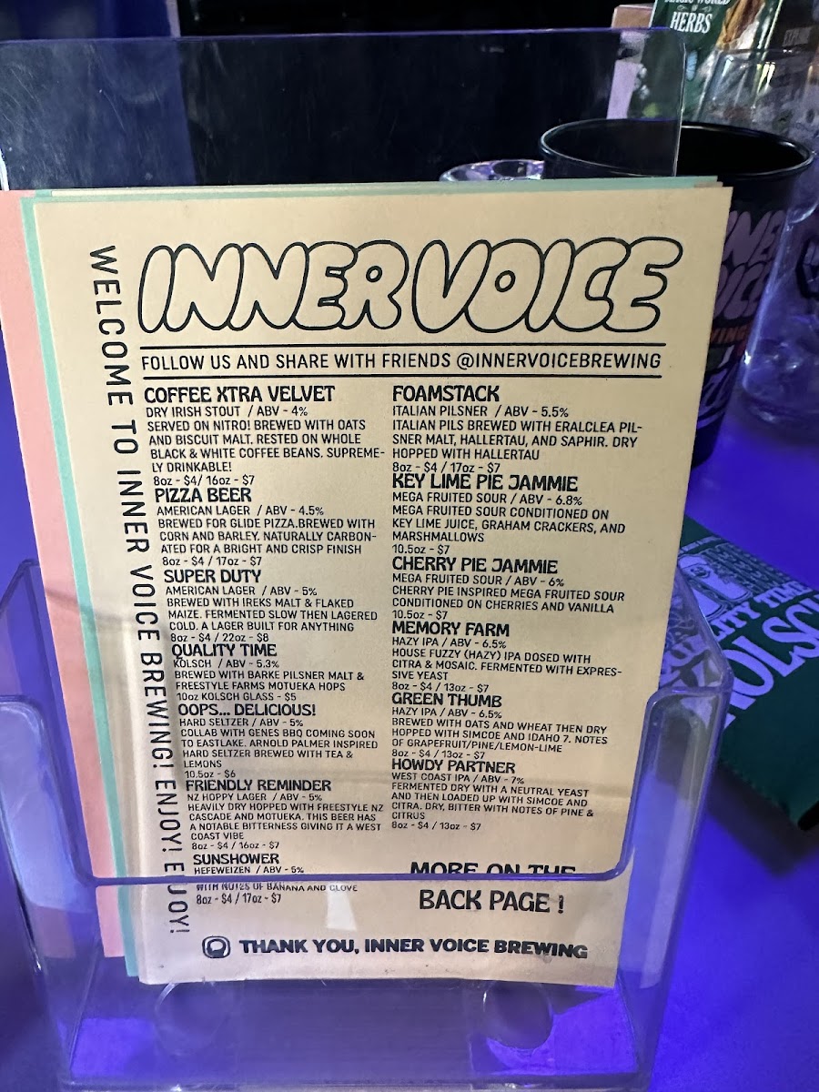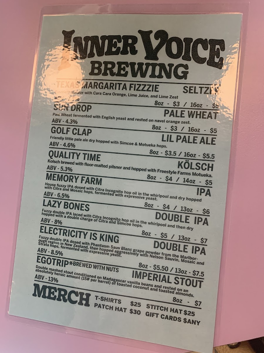 The menu at Inner Voice Brewing offers a thoughtfully curated selection of casual bites and comforting drinks that pair effortlessly with the relaxed brewery atmosphere. Expect a mix of light snacks and shared plates alongside a rotating lineup of craft beers that showcase creative flavors and approachable styles.